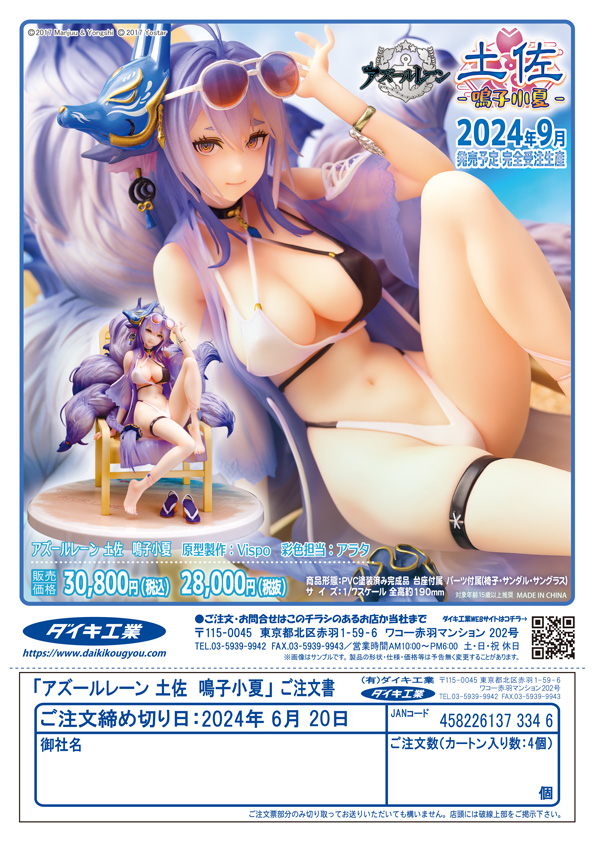 | ■人気アプリゲーム『アズールレーン』より重桜所属の戦艦の一隻「土佐」の人気着せ替えスキン【鳴子小夏】をVISPO氏が原型を製作、彩色はアラタ氏が担当し立体化! 「視察とな。…貴様、この炎天下でよくそんなに熱心でいられるな。よもや邪な発想に取り憑かれているのではあるまいな」 |